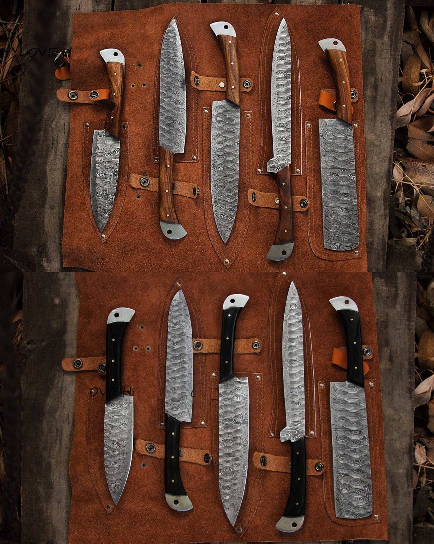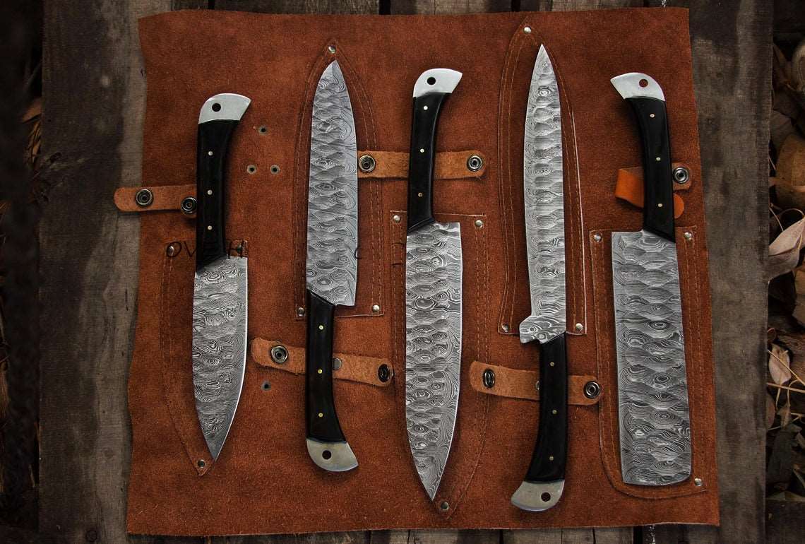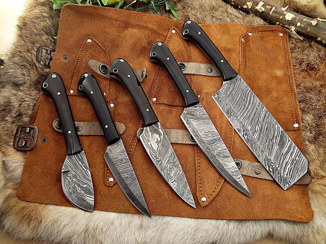5-Pcs Handmade Damascus steel chef knife Set/Kitchen knife Leather Roll/valentine Gift/Kitchen and Dinning/gift for her/Christmas gift - Troy Blades