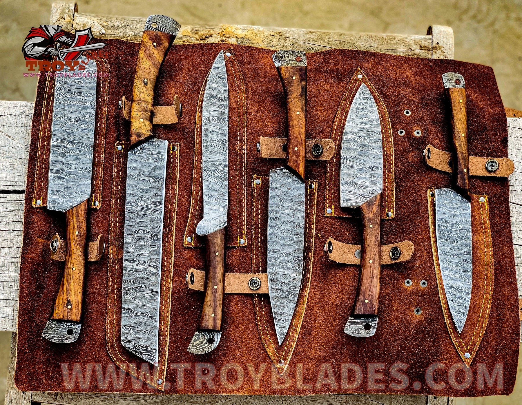 Custom Handmade Kitchen knives set. Overall Length 10" to 14.5''.Handle Made of steel bolster,Rose wood handle .Comes With sweet Leather bag. easy to carry.