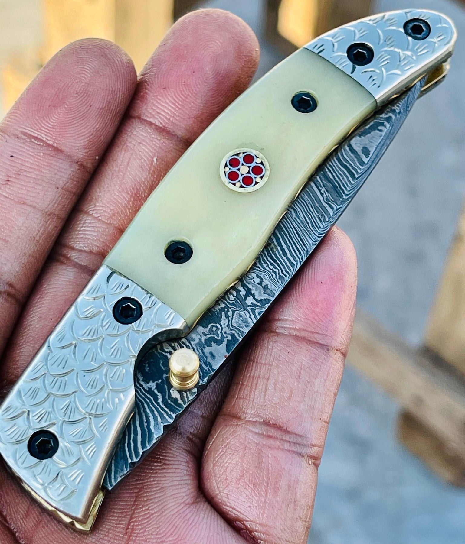 Christmas Gift Beautiful Custom Handmade Damascus Folding knife on Discount