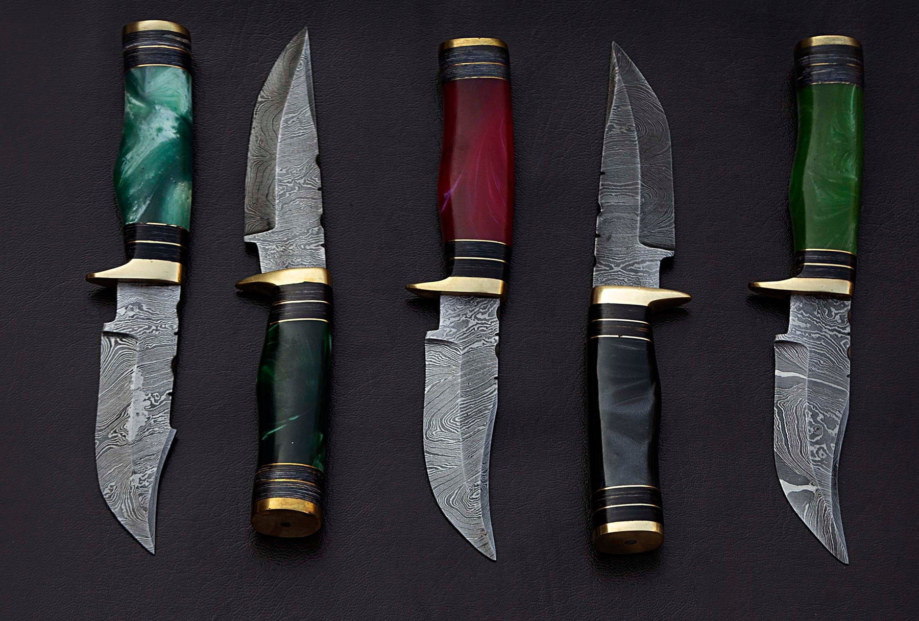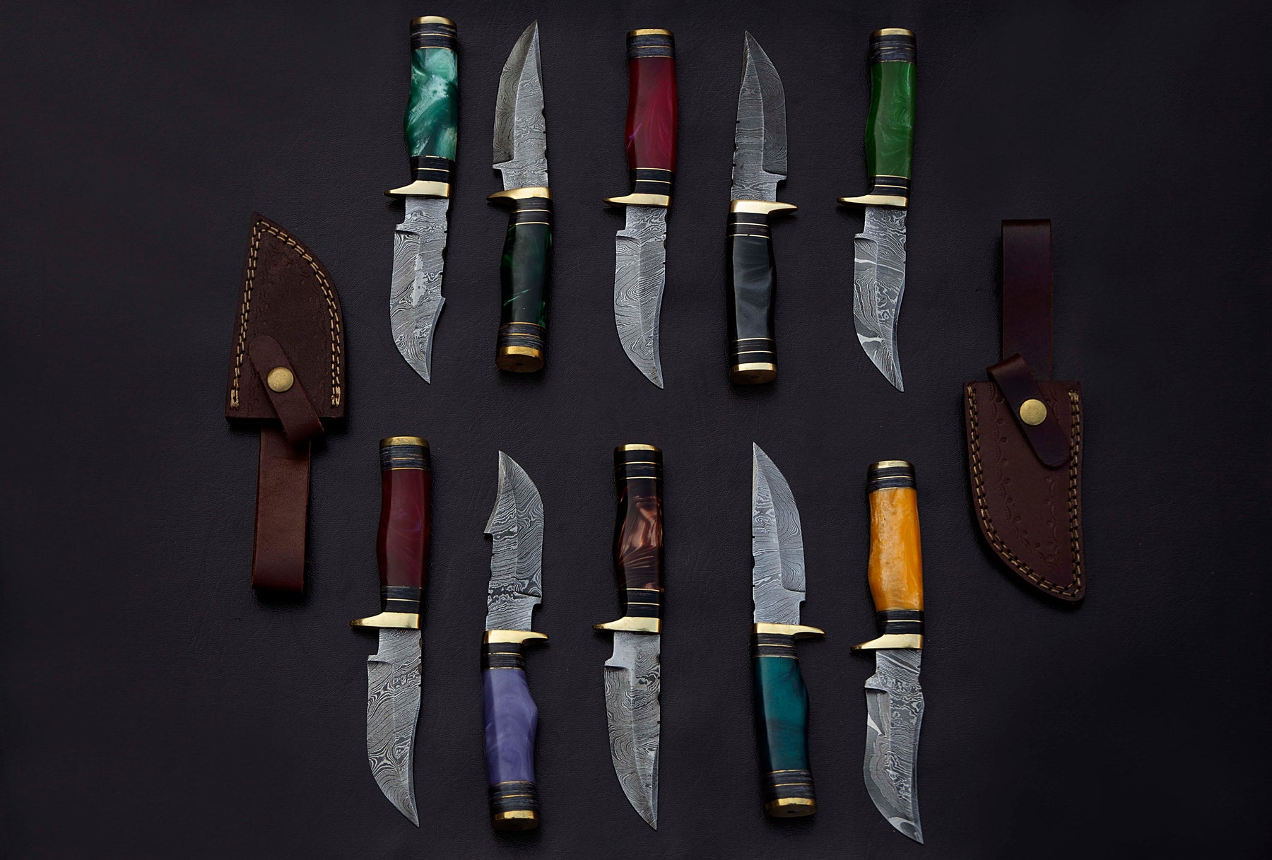 10 pieces assorted colors lot 8" long Damascus steel hunting knife 4" long twist pattern Damascus steel blade Lot contains different color scales scales are equipped with brass finger guard and pommel Each knife comes with a custom Leather sheath Hand forged Twist pattern Damascus steel blade .